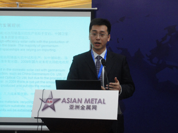 比利時優(yōu)美科集團供應鏈經(jīng)理洛督(Vermeiren, Ludo)與賽迪顧問股份有限公司總裁助理秦海林博士就太陽能行業(yè)用鍺市場需求作了分析,德國弗托尼克紅外公司單晶生長部門經(jīng)理克里斯蒂安博士、昆明北方紅外特種光學技術公司總工程師李茂忠就紅外領域?qū)︽N的需求進行了討論分析,南京中鍺科技股份有限公司(原南京鍺廠有限責任公司)就中國鍺材料和紅外器件產(chǎn)業(yè)鏈發(fā)展作報告,北京國晶輝紅外光學科技有限公司副總經(jīng)理王鐵艷就光纖行業(yè)對鍺的需求進行了展望。